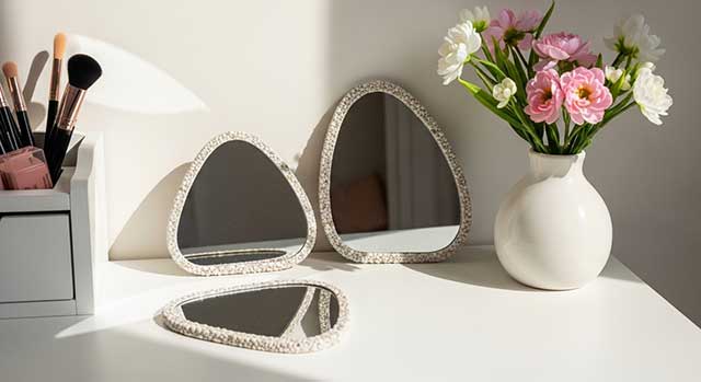 대형 거울만 중요한 게 아닙니다. 책상이나 수납장 위에 두는 소품 하나도 원룸 인테리어의 포인트가 될 수 있습니다. 최근 SNS에서 큰 인기를 끌고 있는 물결 모양이나 조약돌 형태의 미니 거울을 활용해 보세요.