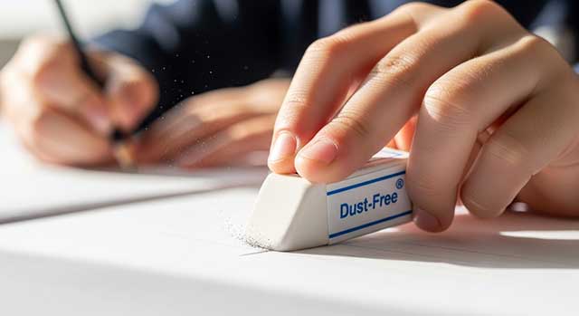 글씨를 쓰는 것만큼 중요한 것이 잘 지우는 것입니다. 특히 힘 조절이 서툰 아이들은 지우개질을 하다가 종이를 찢는 경우가 많죠. 이럴 때는 ‘먼지 적은(Dust-Free)’ 타입의 지우개가 필수입니다.