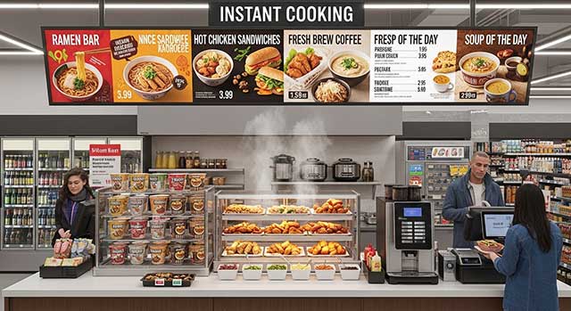 대형 편의점 내부에 설치된 즉석조리 코너는 이제 단순한 간편식을 넘어 전문 맛집의 영역을 위협하고 있습니다. 공간이 넓어진 만큼 설비의 규모도 커졌기 때문입니다.