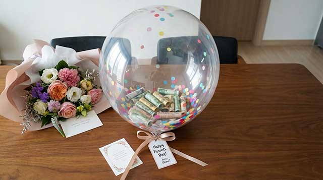 - 용돈 풍선 (Money Balloon): 커다란 헬륨 풍선 안에 카네이션 조화와 함께 용돈을 넣는 방식입니다. 박스를 개봉하는 순간 풍선이 둥실 떠오르며 그 아래로 돈 줄기가 매달려 올라가는 모습은 부모님께 잊지 못할 ‘인스타그래머블’한 순간을 선물합니다.