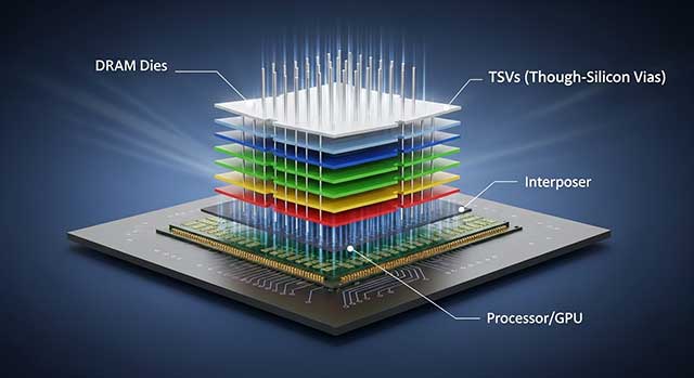 HBM의 핵심은 ‘적층’입니다. 일반적인 D램이 단층 주택이라면, HBM은 초고층 빌딩입니다.